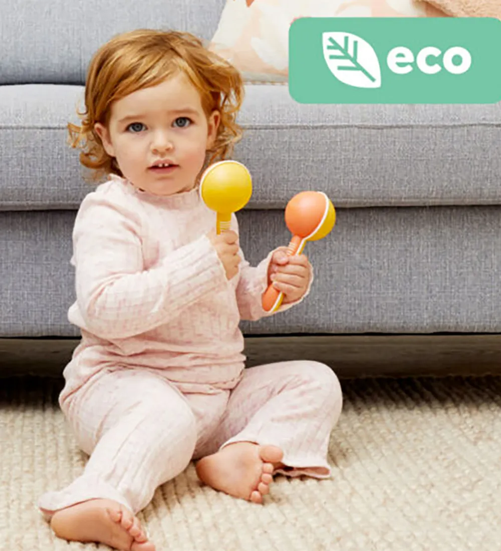 Flotte Tiger Tribe maracas i lys orange og gul, hvoraf den gule side også har print af et smilende ansigt. Den praktiske størrelse gør dem nemme at holde, og de lyse farver tilføjer et farverigt touch. Tiger Tribe garanterer musikalsk sjov for de små.