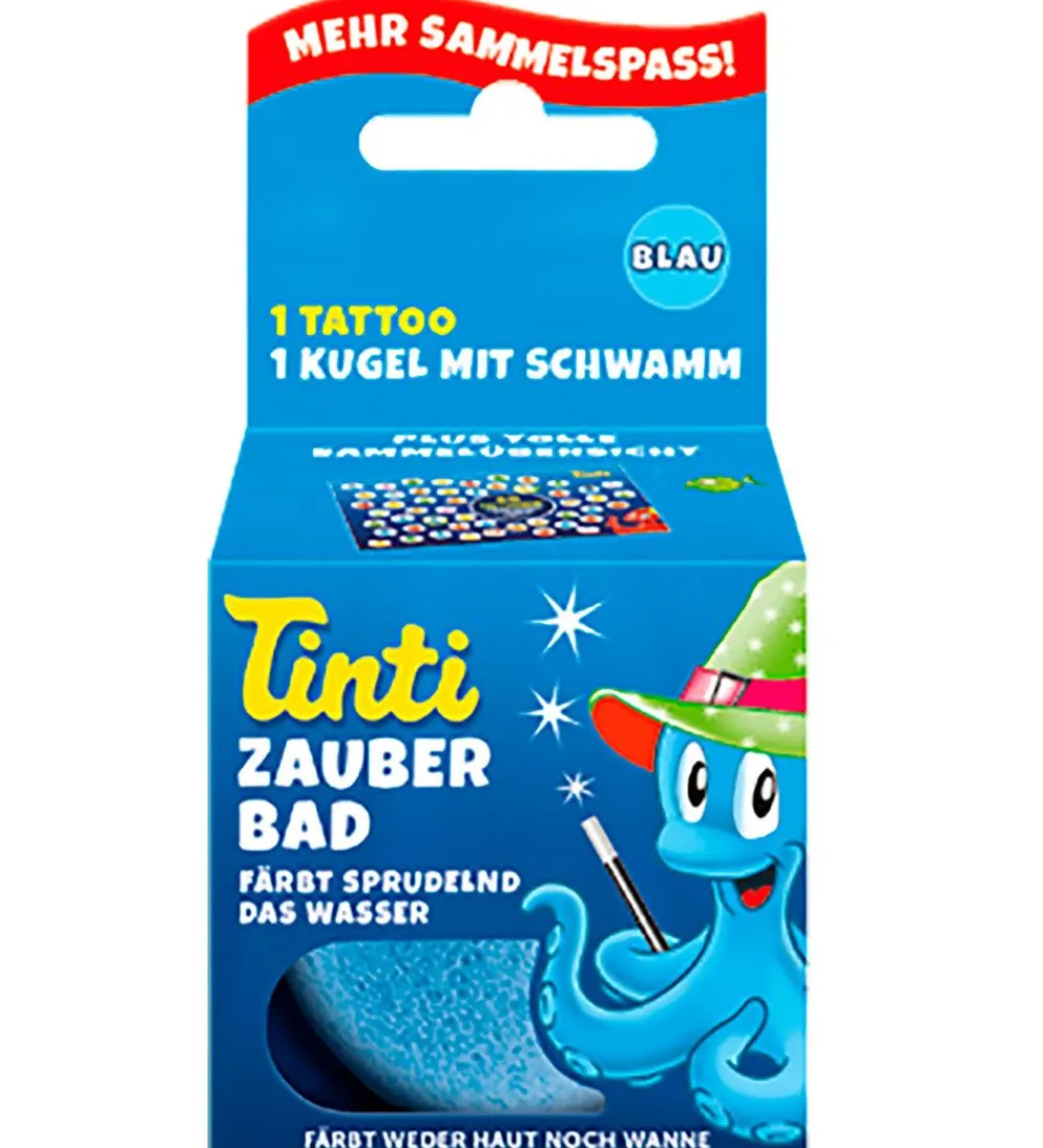 Sej Tinti tryllekugle i blå, der farver vandet lyseblåt. Denne bath bomb kan farve op til 70 liter vand.