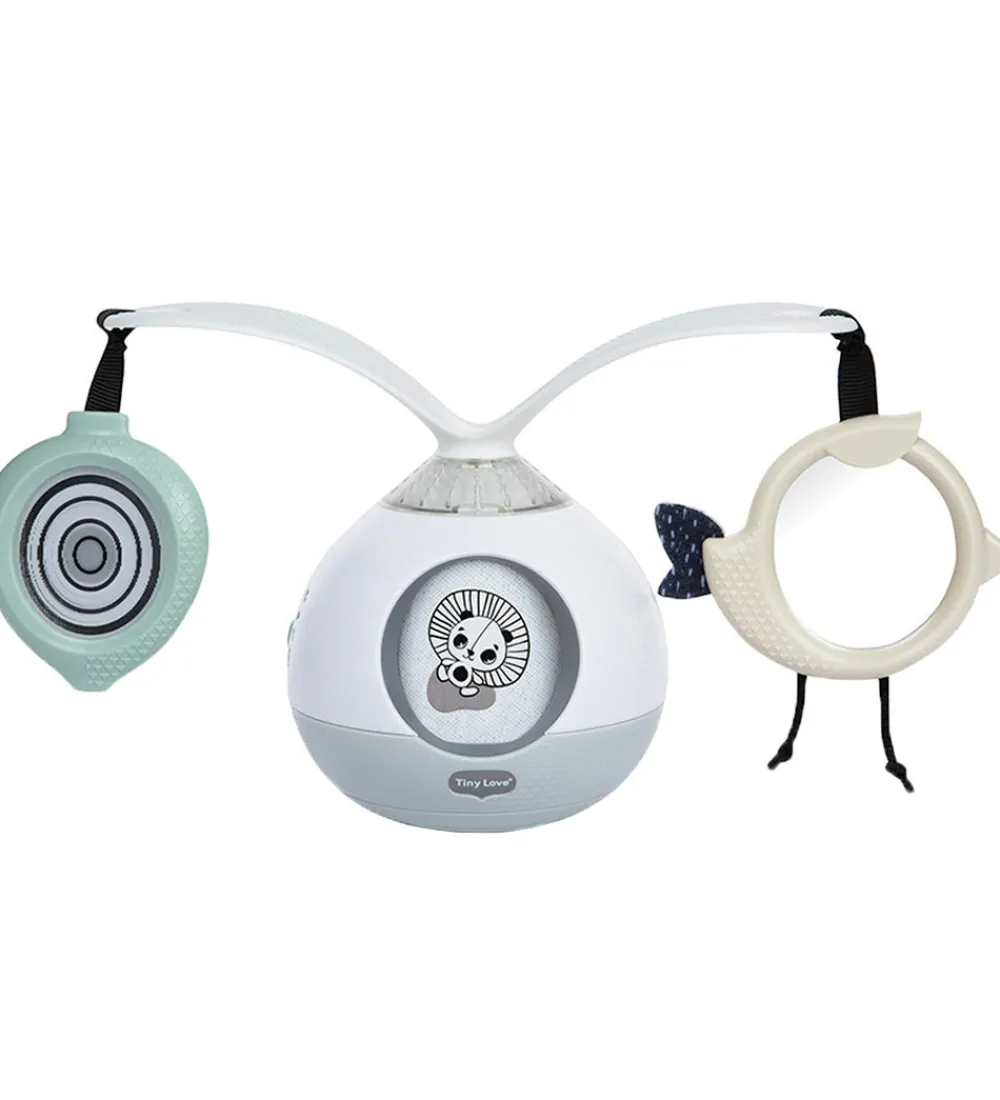 Tiny Love aktivitetslegetøjet kan bruges på to måder: enten som et legetøj, der motiverer barnet til at ligge på maven eller som en uro.