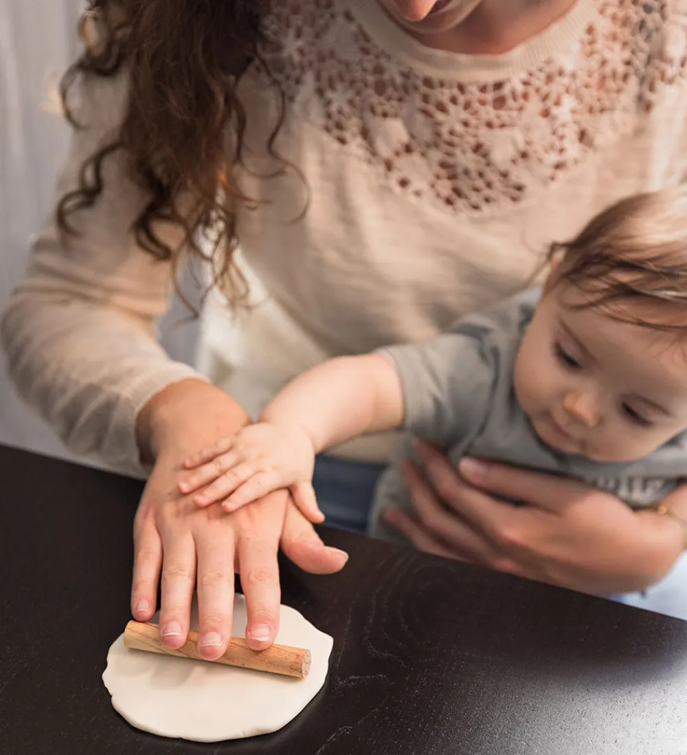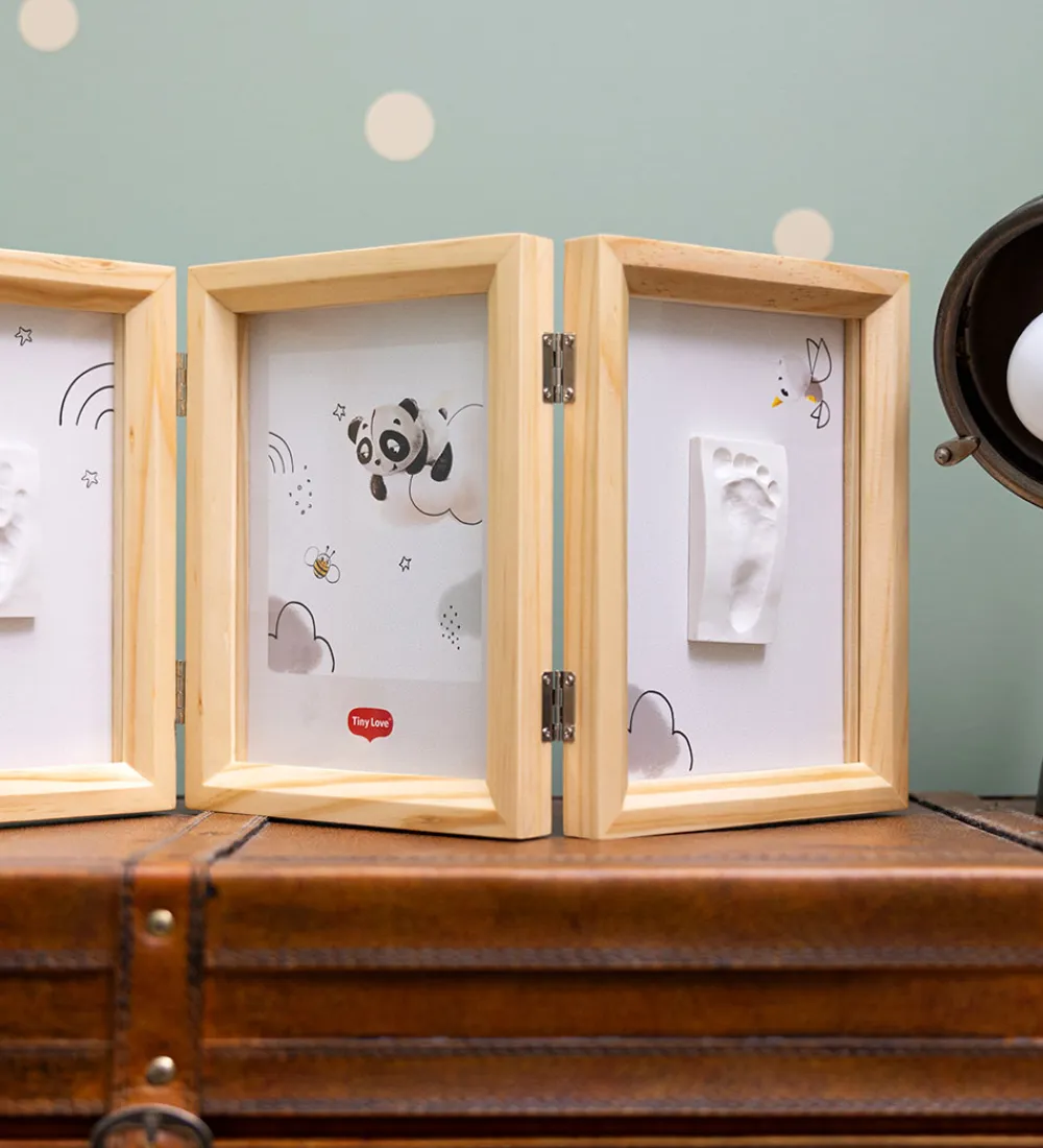 Smart Tiny Love aftryksæt med en triple billedramme i træ. Tiny Love sættet indeholder alt, der skal bruges til at lave et hånd- og fodaftryk af din baby. Med sættet kan du forevige minder af din baby, og med den medfølgende billedramme kan du lade aftrykket stå til pynt i hjemmet eller bruge det som en personlig gave.
