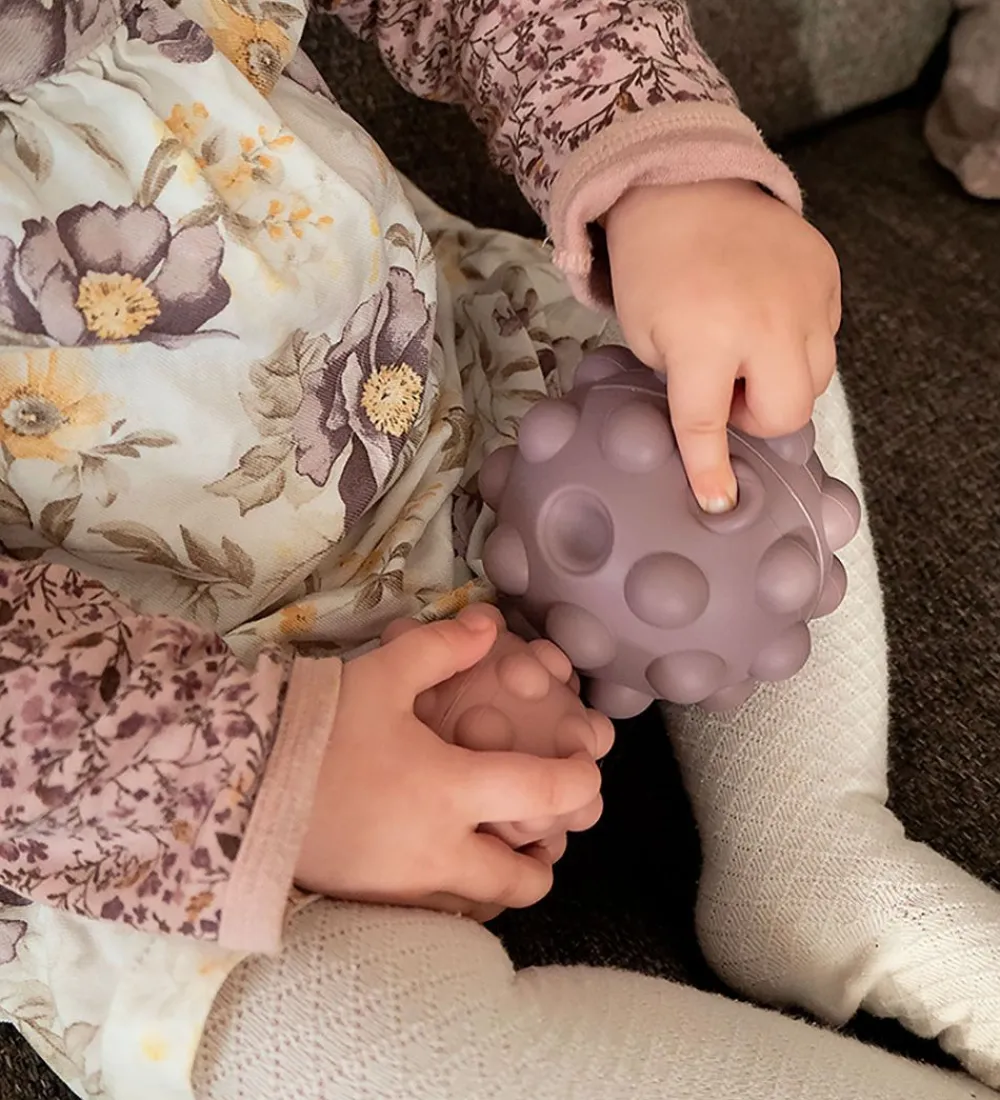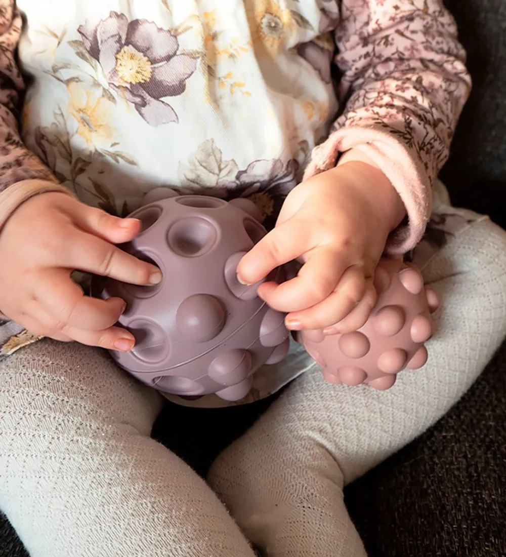 Tiny Tot bolden er blød at røre ved og nem for det lille barn at gribe fat i og bide i. Legetøjet er fyldt pop fidgets, som stimulerer sanserne og motorikken. Bolden tåler at komme i opvaskemaskinen.