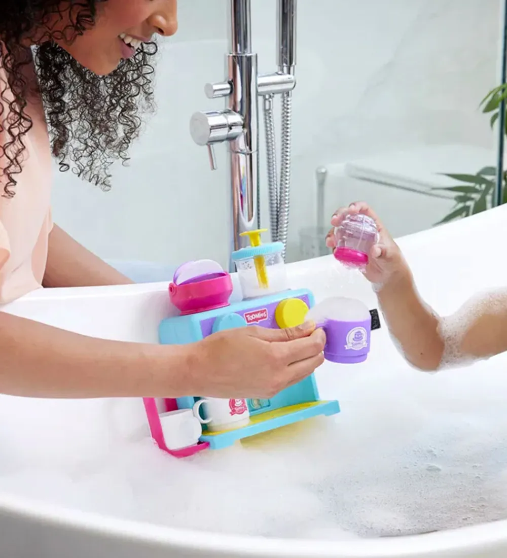 Toomies badelegetøjet inkluderer flere krus og en sjov kaffemaskine, der inspirerer til leg og kreativitet. Barnets fantasi og kreativitet bliver stimuleret, med kaffemaskinen og de mange sjove elementer den kommer med. Der er blandt andet et drejende hjul og en pumpe så man kan lave bobler og skabe sine helt egne bobbelopskrifter.