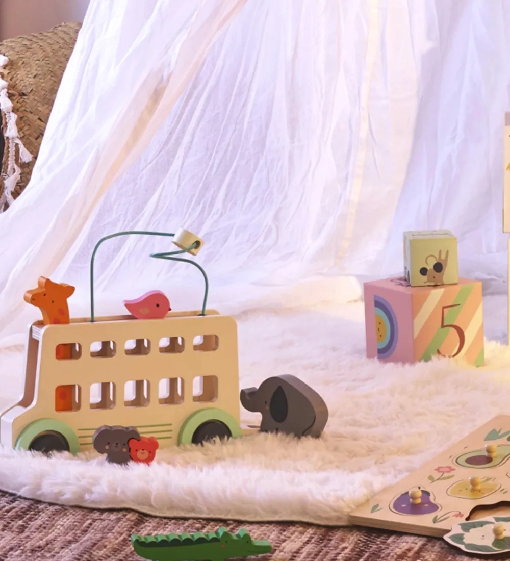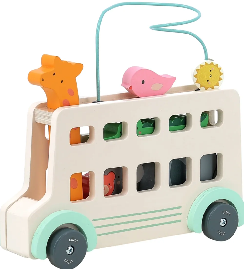 Sødt Vilac aktivitetslegetøj i form af en bus med forskellige dyr i afdæmpede farver.