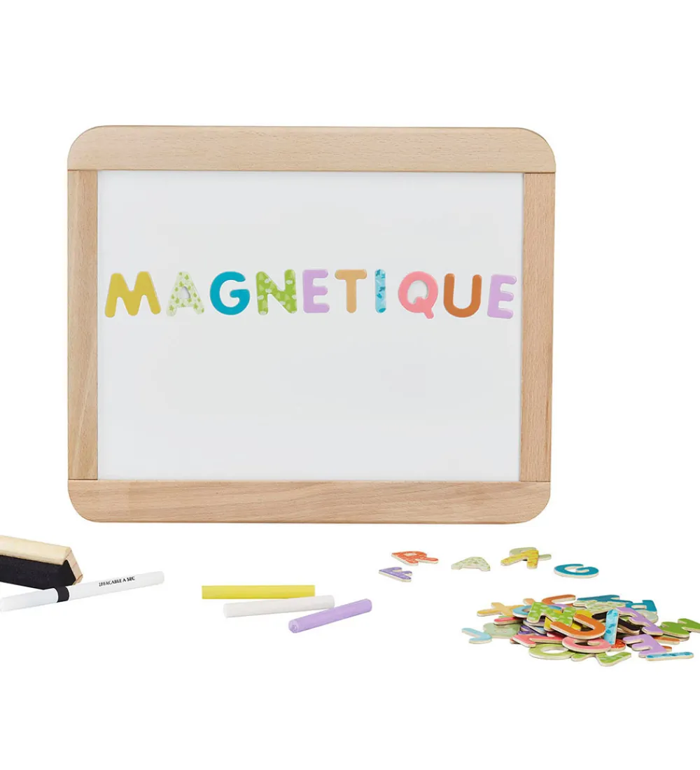 Praktisk Vilac trætavle der er vendbar og kommer med 50 farverige magnetbogstaver, en tusch, 3 kridt samt en udvisker. Perfekt til kreativ leg og læring.