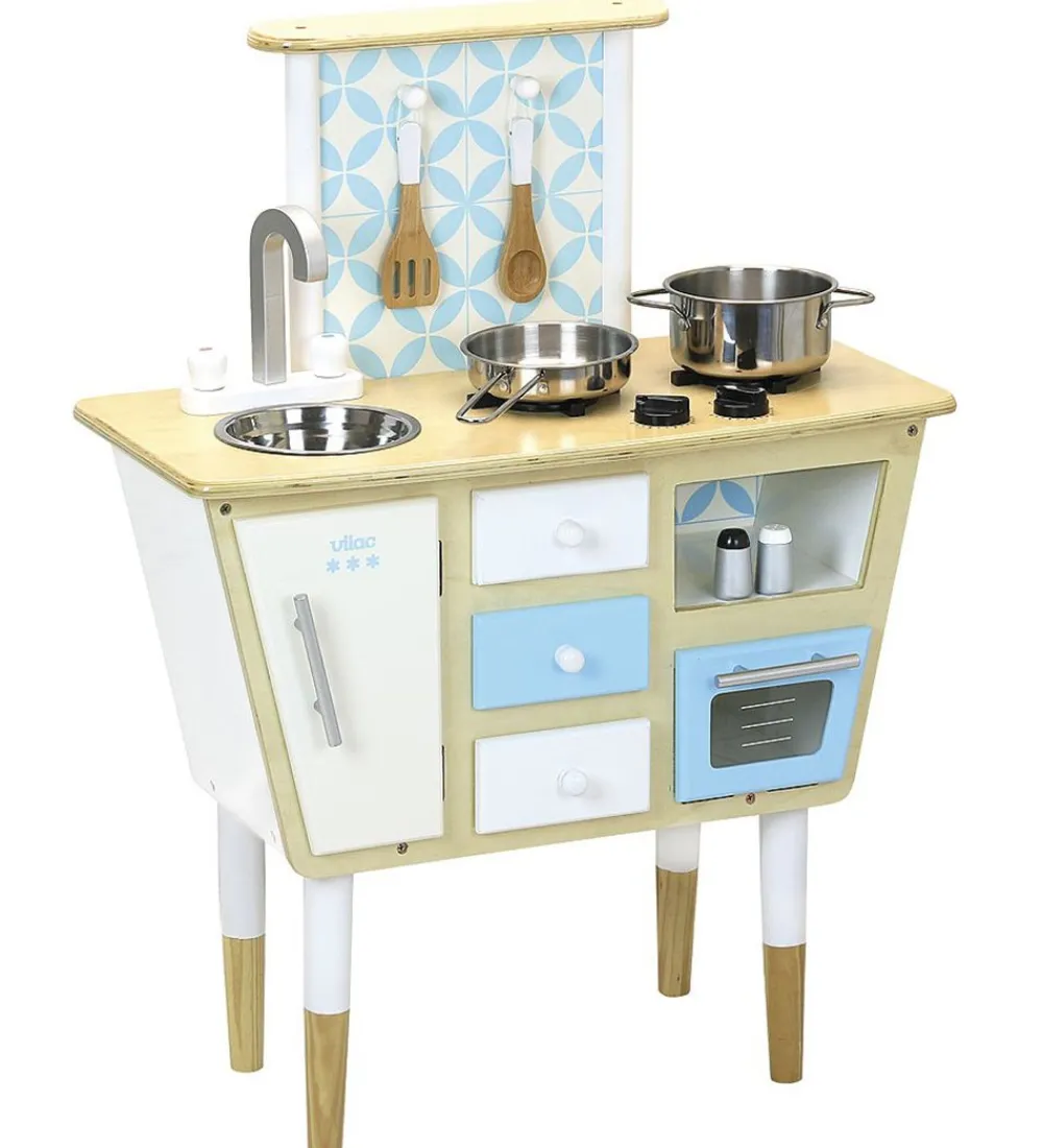 Vilac køkkenet er fuld udstyred med ovn, håndvask, kogeplader og opbevaringsplads, samt knager til redskaber. Både skabene og ovnen kan åbnes. Knapperne til kogepladerne kan drejes og når dette gøres, siger de klik-lyde.