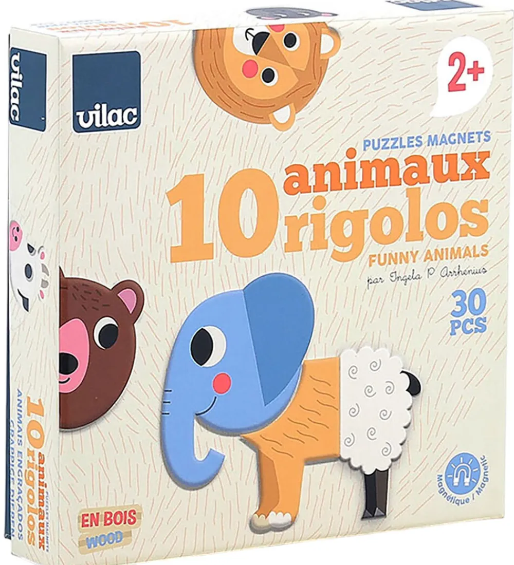 Fantastisk Vilac magnetlegetøj med sjove dyremotiver. Æsken indeholder 30 træbrikker, som kan kombineres til forskellige figurer. Vilac er kendt for deres kreative legehøjder.