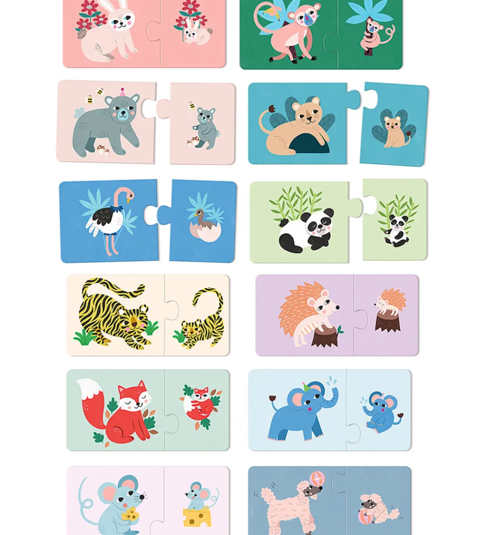 Sjovt Vilac puslespil, bestående af 12 separate, farverige puslespil á 2 brikker hver med motiv af en dyremor og -baby.