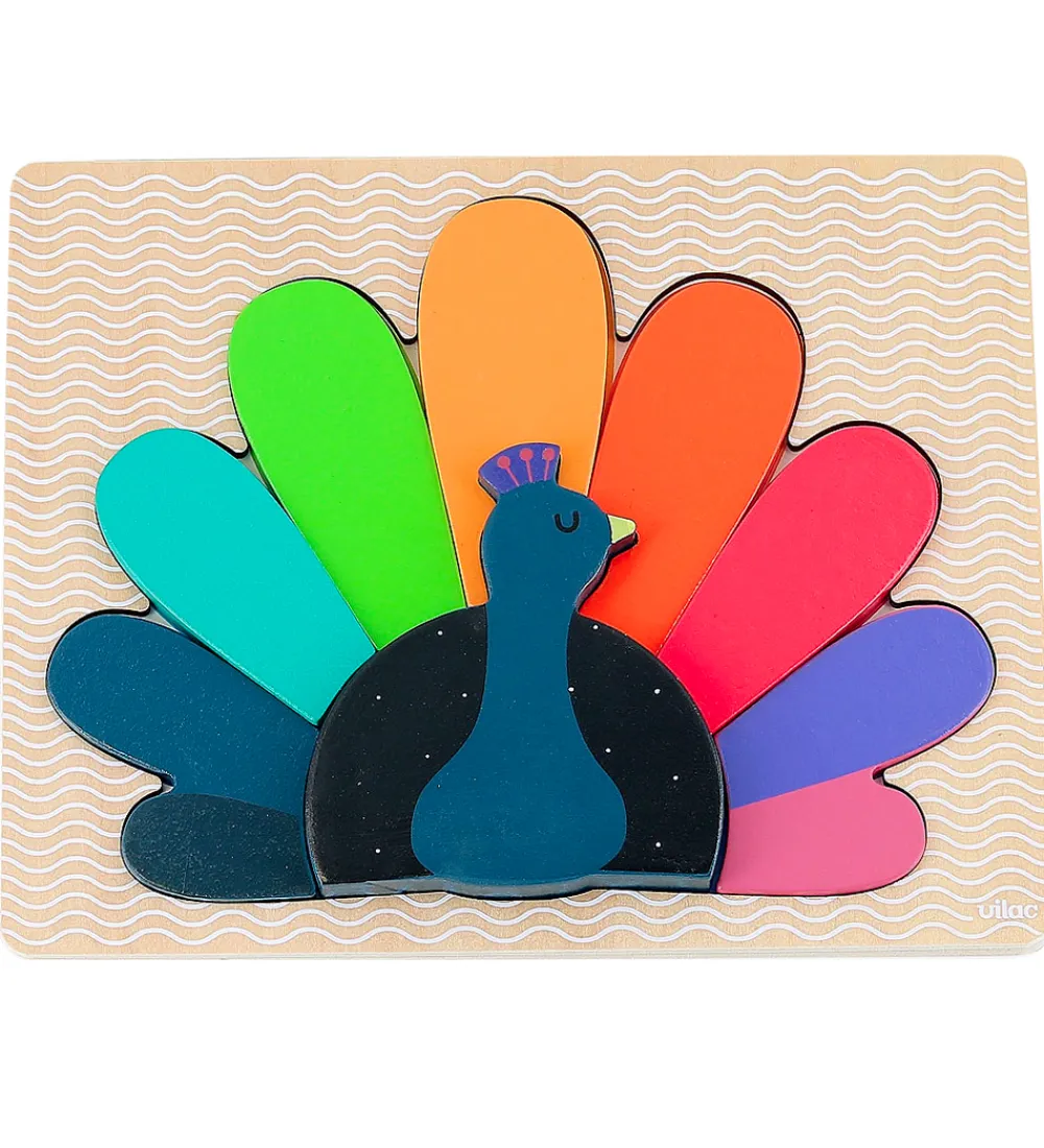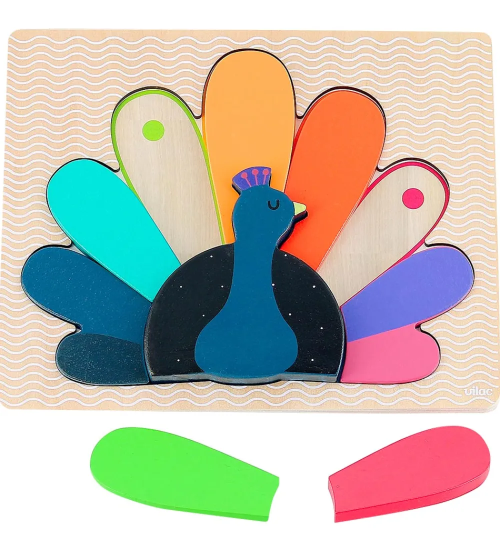 Sjovt Vilac puslespil, der forestiller en farverig påfugl, som samles i en plade.