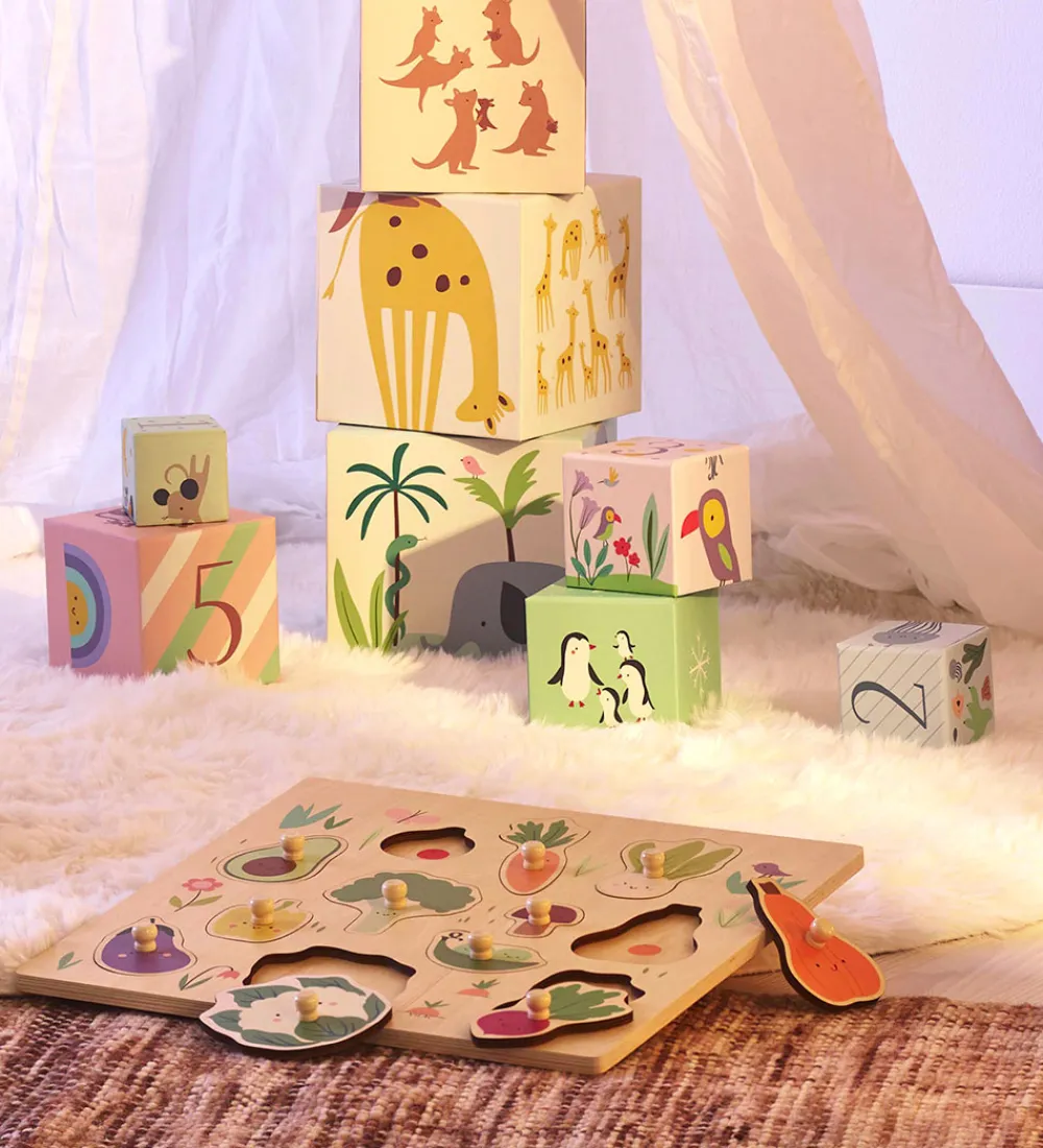 Vilac puslespillet består af 12 brikker, som har hver sin unikke form og skal placeres i de tilsvarende huller i puslepladen. Puslepladen har gode, afrundede kanter.