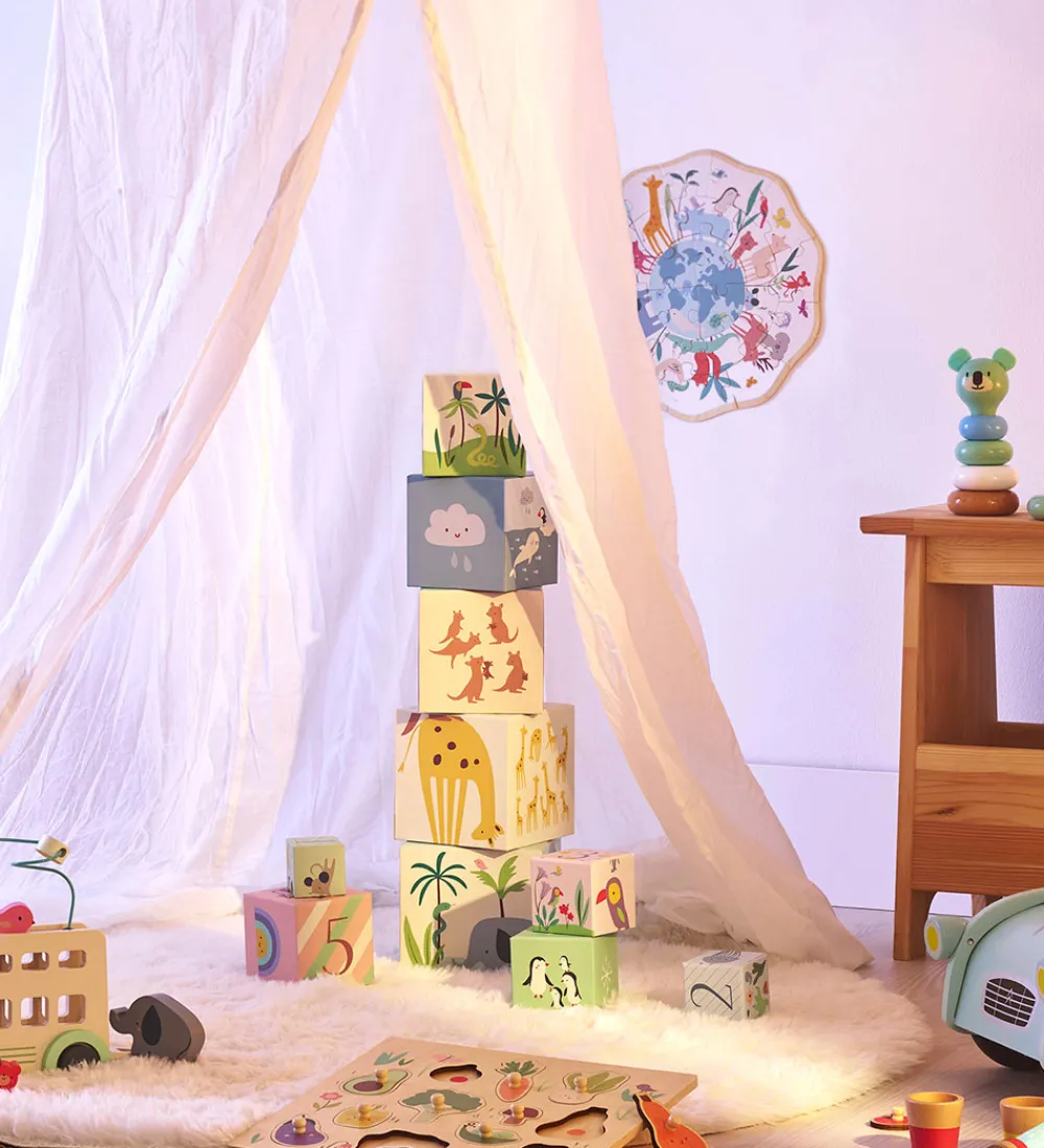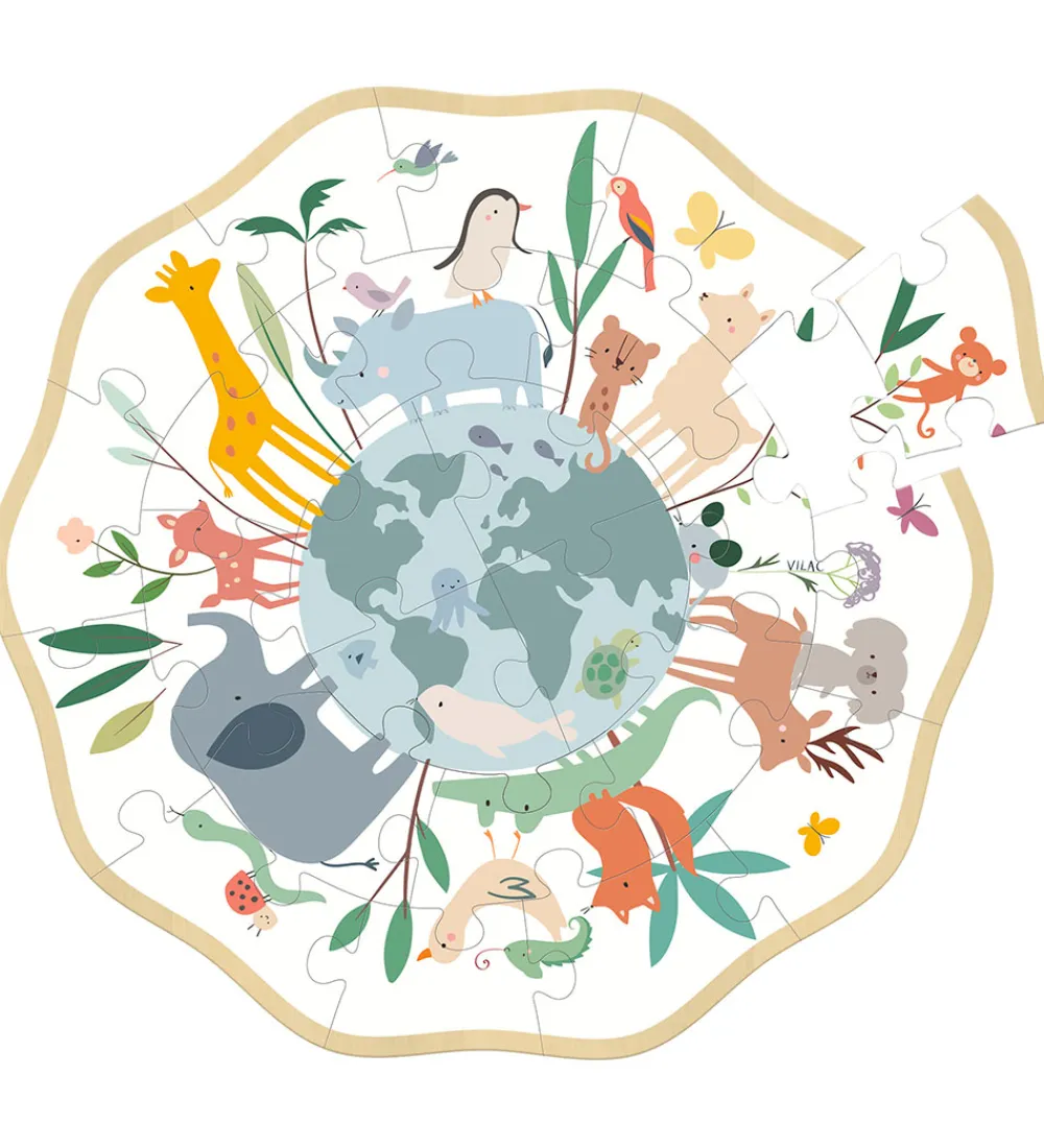 Sjovt Vilac puslespil med ne rund form med bølgede kanter med 24 brikker med et motiv af jorden med søde dyr rundt om.
