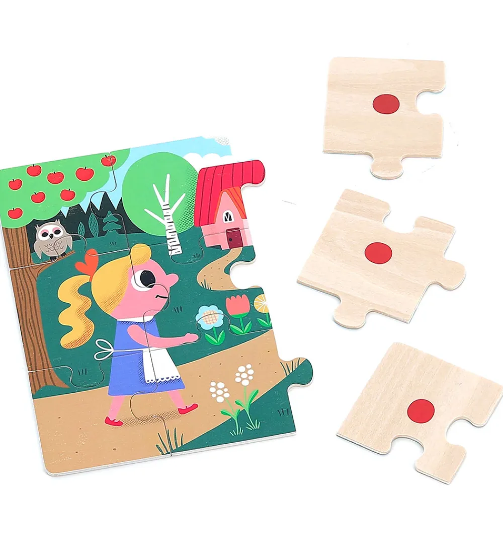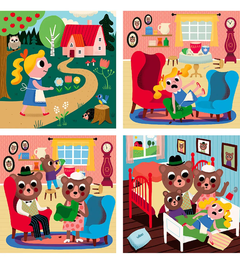 Sjovt Vilac puslespil, bestående af 4 separate, farverige puslespil á 9 brikker hver med motiv af scener fra guldlok og de tre bjørne.