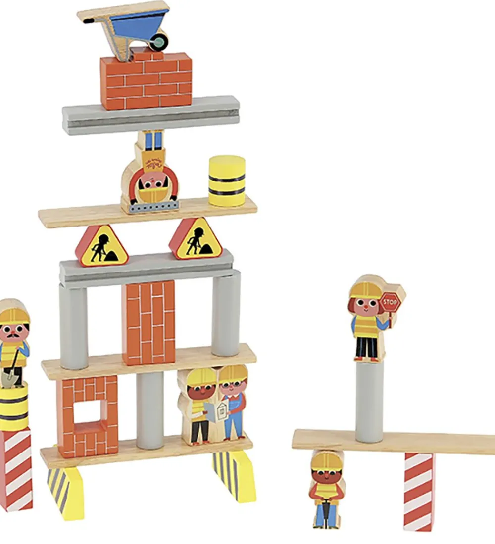 Vilac spillet består af 27 dele i træ, med sjove motiver fra en byggeplads. Spillet går ud på, at stable så mange af delene som muligt, uden at det vælter. Spillet er med til at lære de små om balance og styrker finmotorikken.