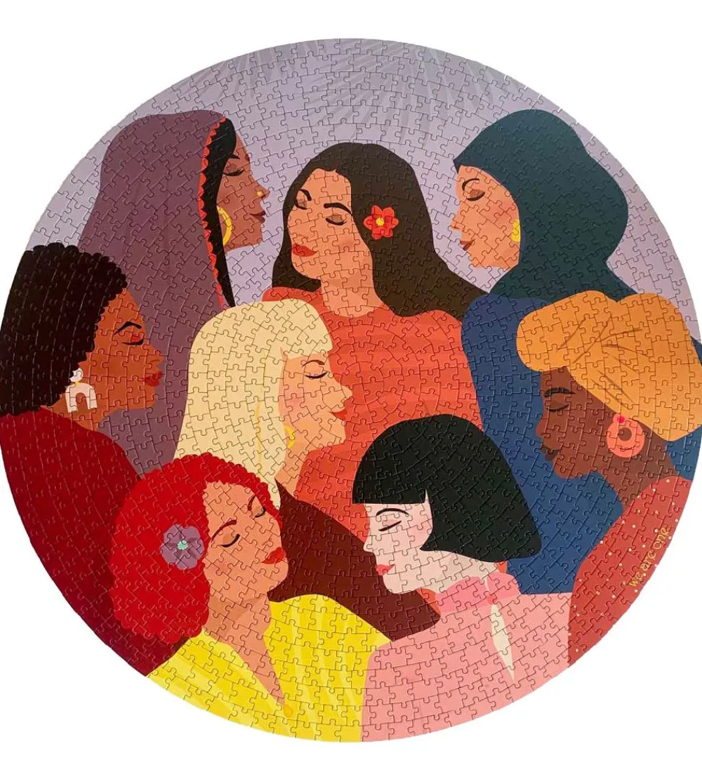 Flot Vissevasse puslespil med et motiv af otte kvinder fra forskellige kulturer i dæmpede farver.