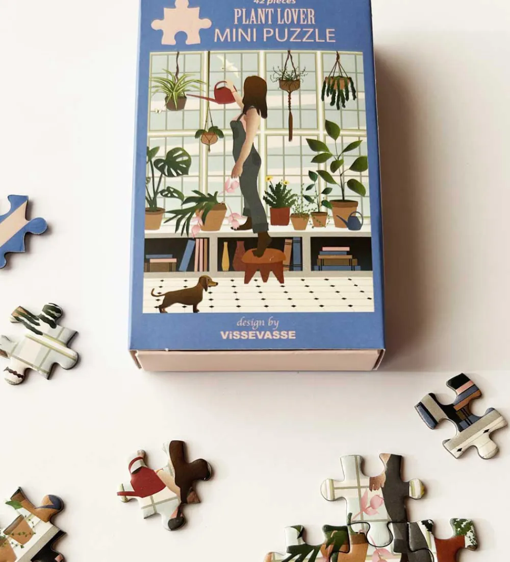 Fint Vissevasse puslespil i en mini-udgave med et motiv af en kvinde, som vander sine mange planter i vinduet.