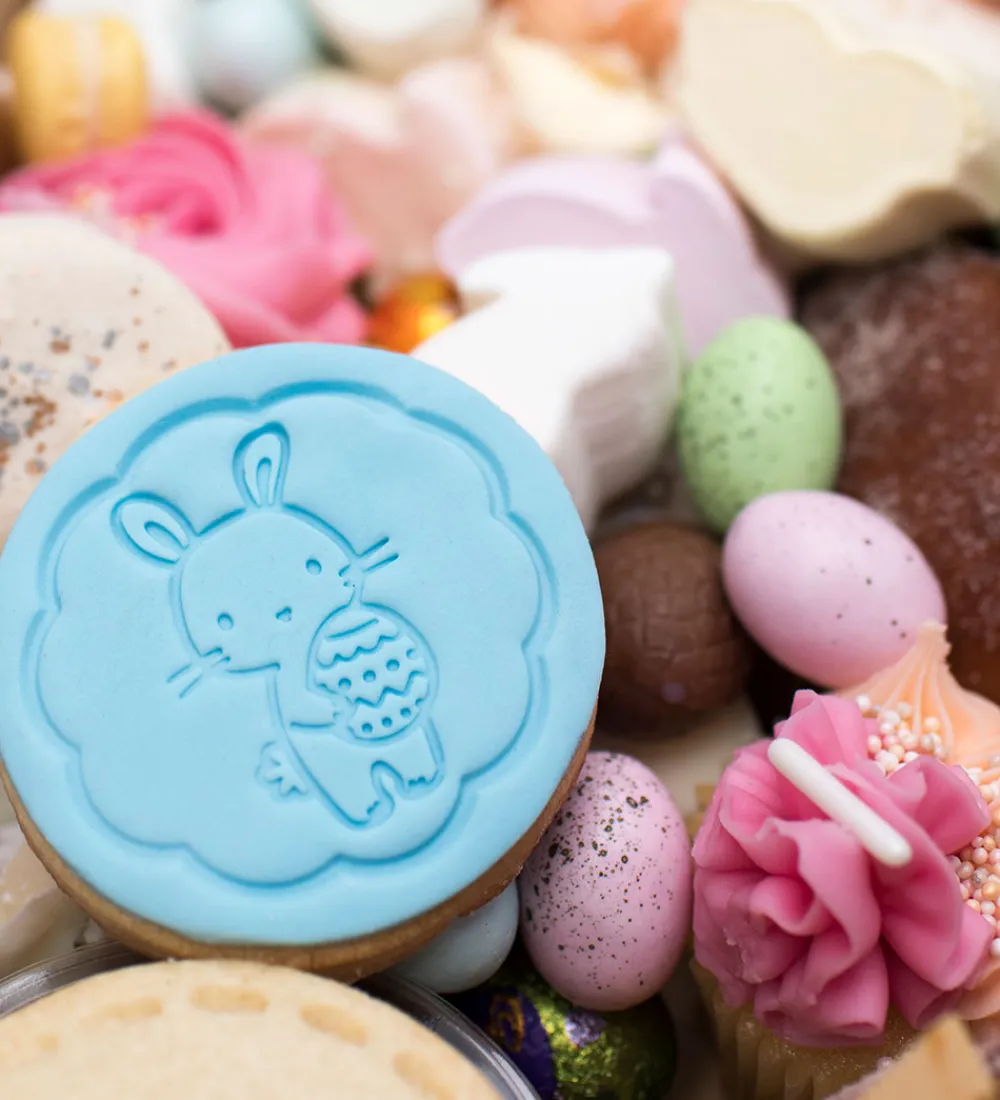 Spændende We Might Be Tiny stempelsæt, bestående af 6 silikone stempler med påskemotiver og et træhåndtag med en metalkant.