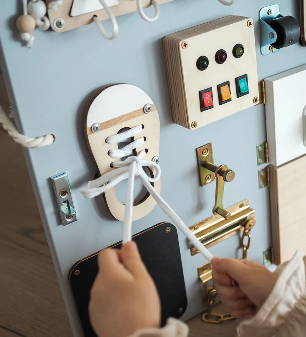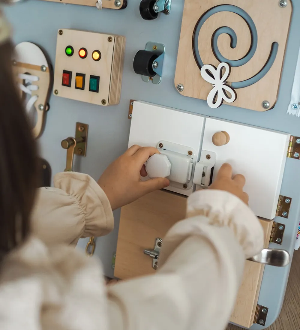 Woobiboo Woobiboardet er en aktivitetstavle, som kombinerer læring og leg. Den er designet til at vække barnets nysgerrighed og gennem leg styrke en række færdigheder. Woobiboardet styrker motorikken og logisk tænkning samt barnets uafhængighed, tålmodighed og psykomotoriske færdigheder. Woobiboardet rummer følgende aktiviteter: