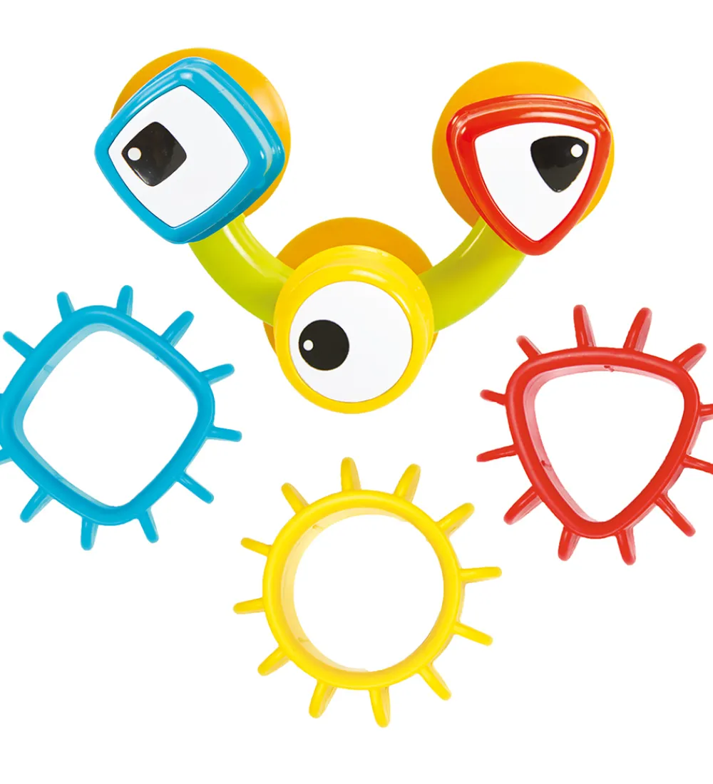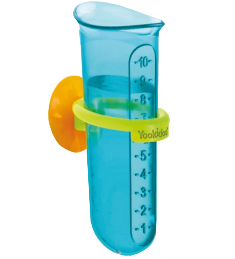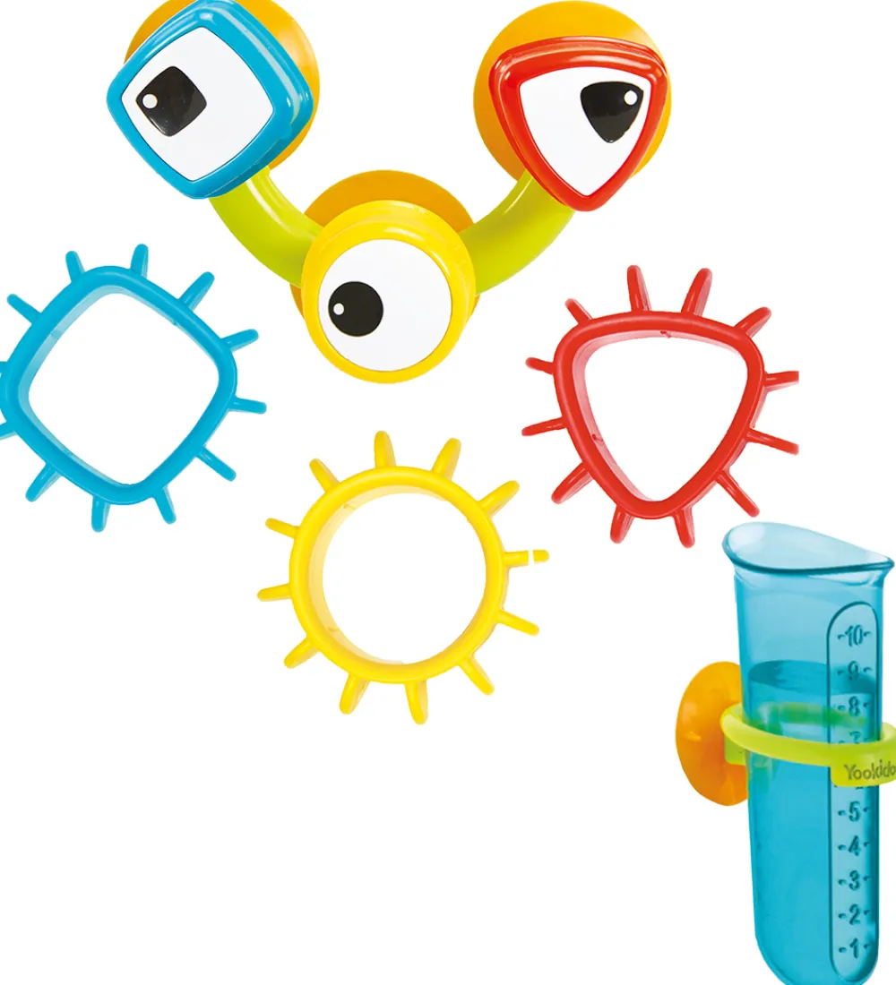 Yookidoo badelegetøjet vil med sikkerhed gøre tiden i badet sjov. Badelegetøjet sættes fast med sugekopper på badekarret eller væggen. Barnet kan bruge glasset til at hælde vand på gearene, som vil begynde at dreje.